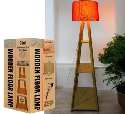 WolkomHome Floor Lamp 3in1 Table Lamp Wooden Furniture 3 Shelf Including Orange Lamp Shade, E27 Edison Bulb, E27 Holder, Nut Bolt for Living Room Lighting, Bedroom Lighting, Home and office Decor, Podcast room decor